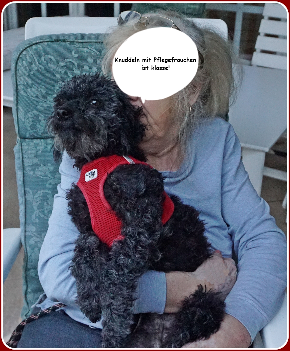 Die kleine Pudelmixdame geht gerne spazieren und liebt es, mit dem Pflegefrauchen zu schmusen.